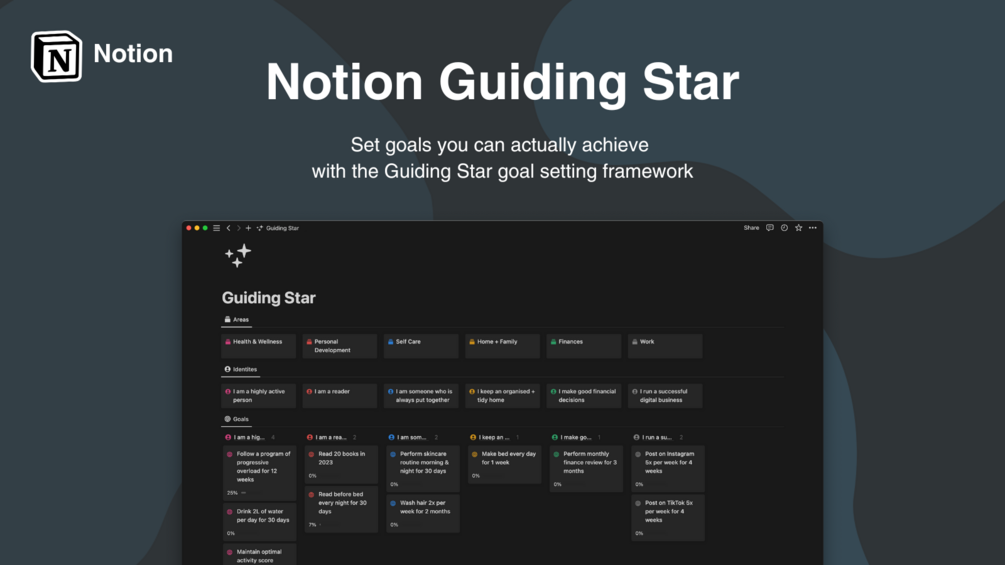 Notion Guiding Star is a goal setting framework that allows you to identify what you really want, and then set SMART goals in order to achieve your dreams.